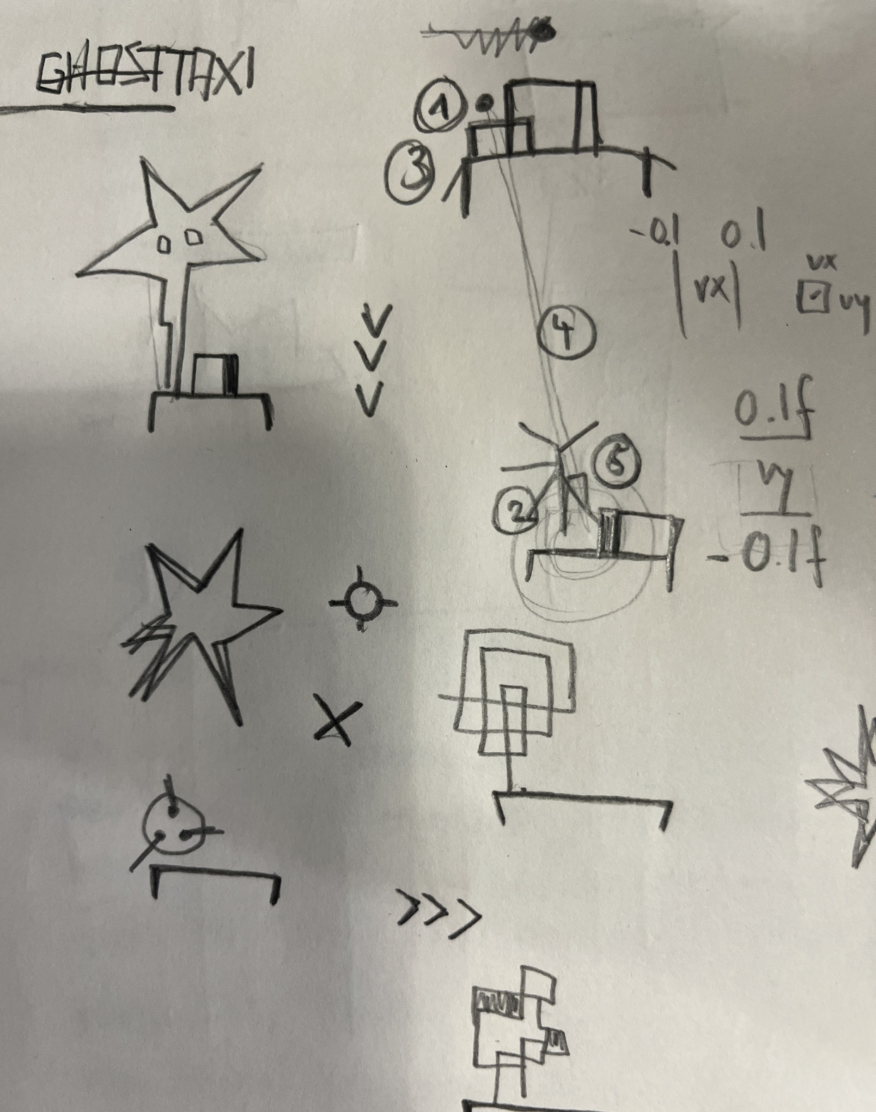 GhostTaxi könnte eine Version von SpaceTaxi sein. Man transportiert aber „Ghosts“ oder „Formen“. Die Idee man holt etwas ab per Stift und fliegt mit ihm übers Blatt (oder zeichnet übers Blatt). Dann landet man und lässt die Form ziehen. Dabei entstehen dann (Tilelose) grosse und kleine Zeichnungen. Durch den Zufall entsteht vielleicht eine interessante Welt. Die einzelnen Figuren könnten auch von verschiedenen Designern*/Zeichnern* sein. Die Grösse wäre variabel. Ein Spiel bei vielleicht einfach um ein interessante Zeichnung gespielt wird.