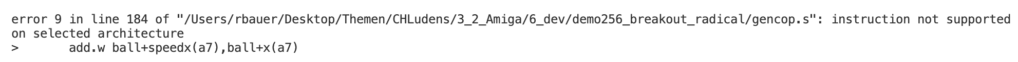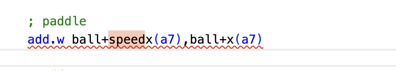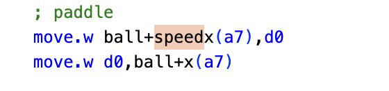 Hier etwa das Addieren einer Speicherstelle zu einer anderen. Dabei sind ball+speedx oder ball+x quasi der zur Memory-Adresse hingezefügte Index: Also in etwa