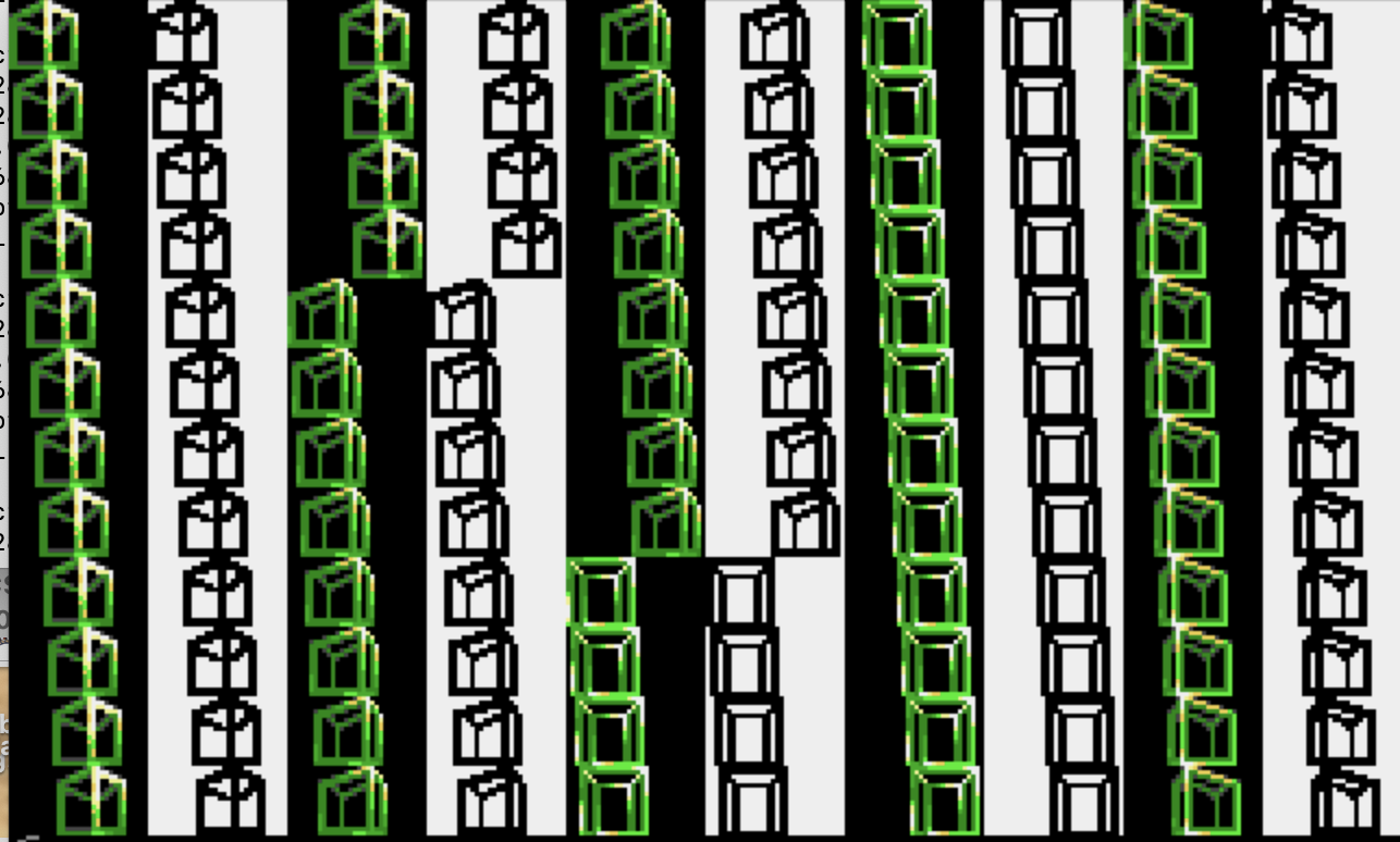 Anbei sieht man eine solche automatisch generierte Masse von 16 x 2er Bläcken und daneben die Maske. Aus dem Spiel TheHolyCube (Atari ST) extra visualisiert, da die Daten nicht so nebeneinander liegen.