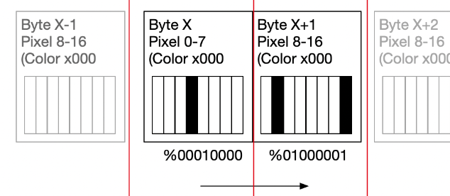 Das Screenmemory hat wie der C64 oder der Amiga so etwas wie Bitplanes. Ein (eher) Bitblock das sind 16 Pixel. Die Farbwerte werden aus 4 Ebenen zusammgesetzt, die je nacheinander kommen.