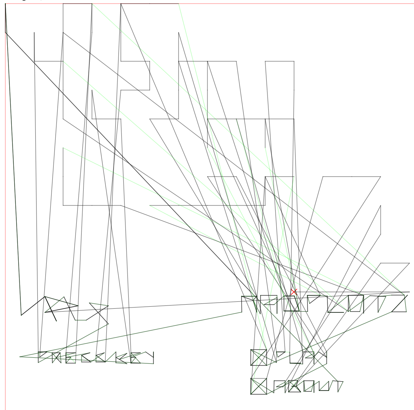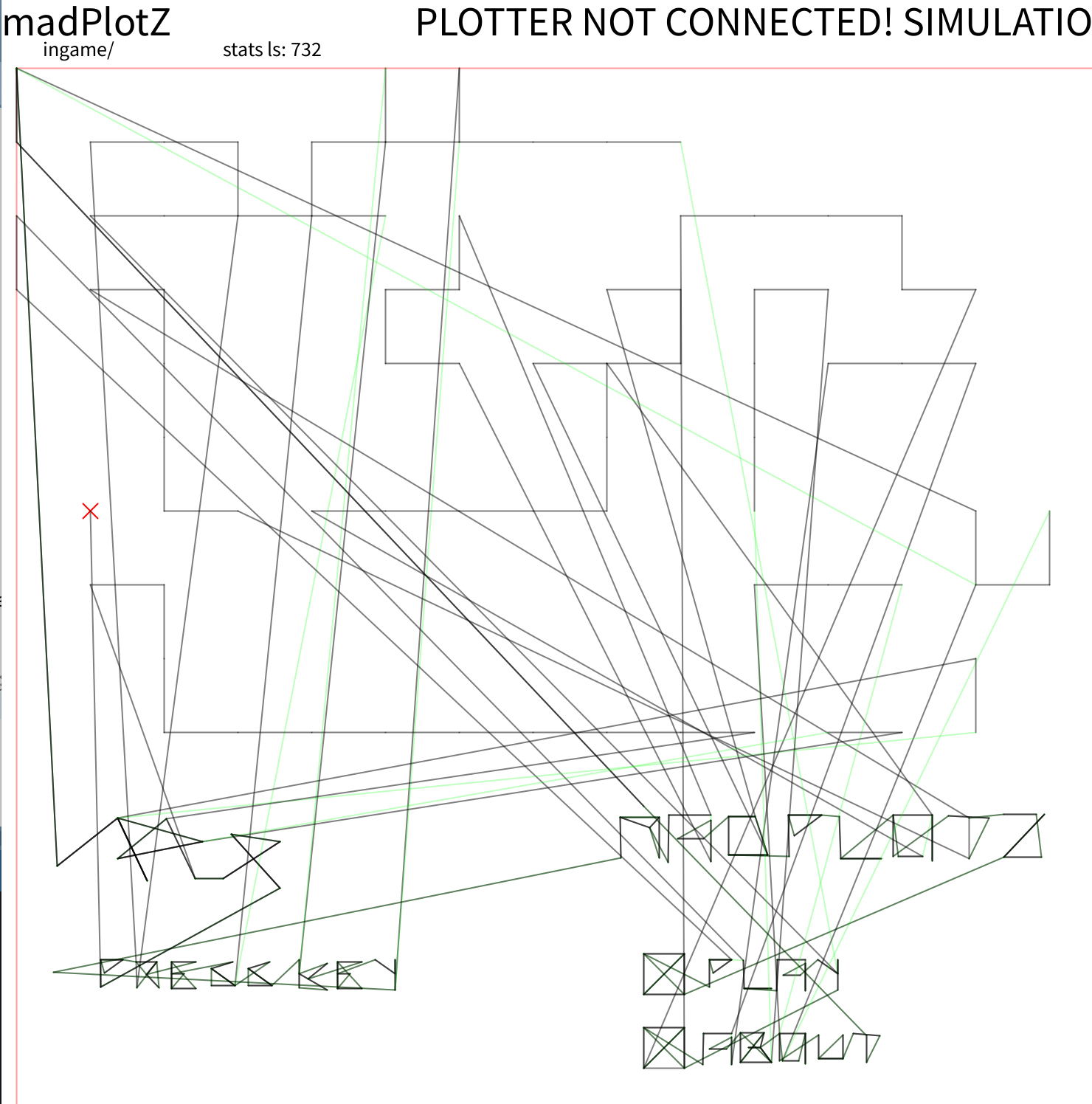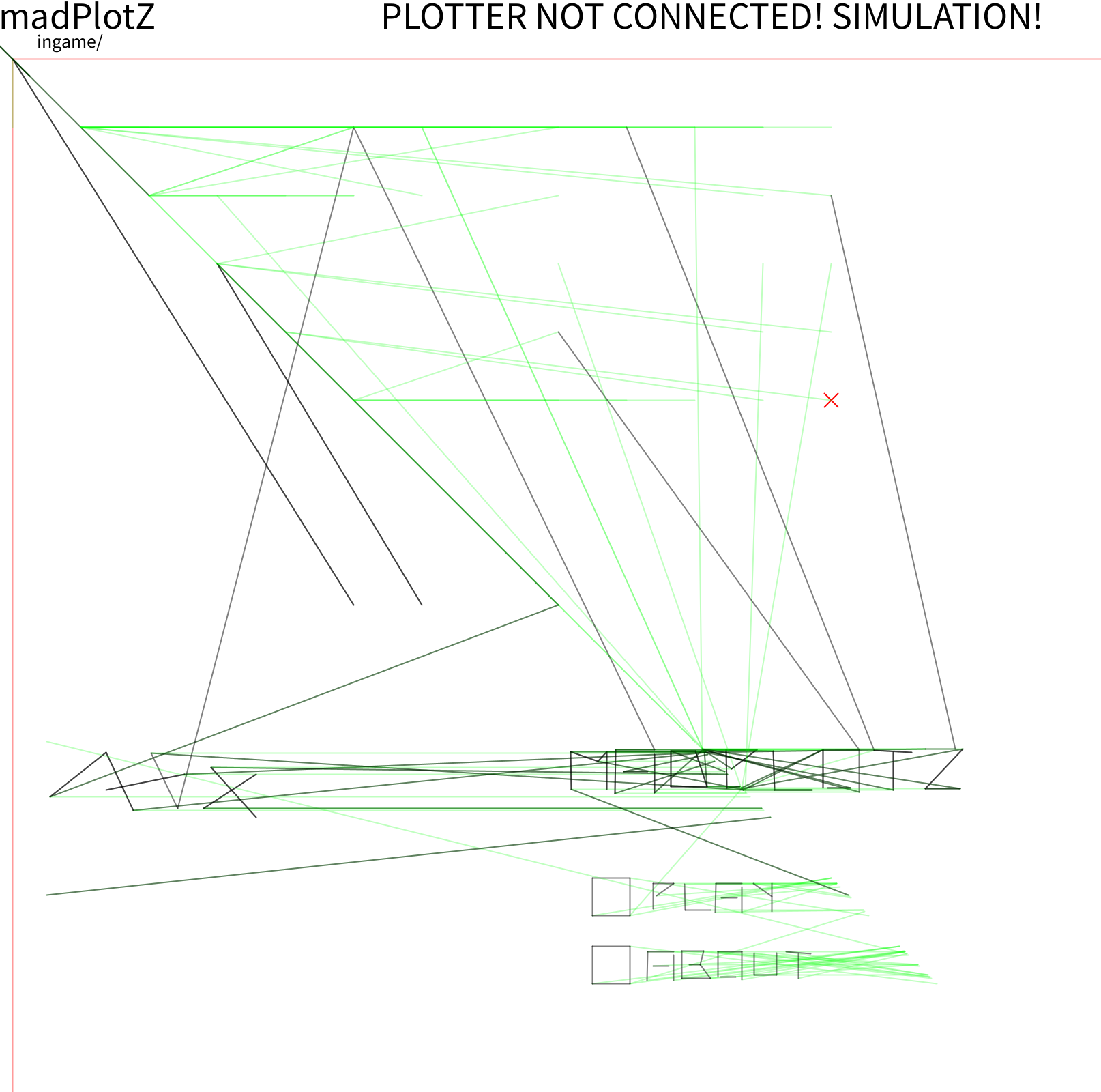 Die neueren Plotter wie der benutzte AxiDraw verfügen über ein sehr eingeschränktes Plotter-Command-Repertoir – es gibt de facto fast nur „Line“ und wenige andere Primitive. Vermutlich entfällt sogar eine eingebaute Schrift. Man kann also nicht einfach einen Text schnell setzen. All das was damals in den 60/70er Jahren eingebaut war in Plottern, das prozessiert heute mehrheitlich der Computer. Wie das bei teuren Plottern ist nicht abschätzbar. Es ist also vermutlich in einem gewissen Sinn damals einfacher gewesen einen Plotter als GameDisplay zu brauchen als heute. Hier muss zuerst mal alles extern erstellt werden, was Fonts anbetrifft.