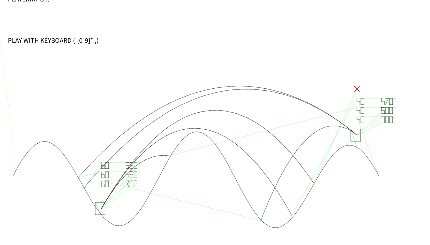 Die einfache Version von Potshot lebt geradezu manisch von Parametern. Es dynamisiert damit ganze Weltbilder, die davor eher Imagination oder Handarbeit waren (beim Graphenzeichnen). Hier könnte man tatsächlich berechnen, wie die Parameter sind! Also das Eingeben und Anwenden. Es gibt allerdings auch die Methode Try&Error. Die Eingabe und dann die Simulation, was im System passiert. Statt Zahlenreihen oder einem ‚Getroffen‘ oder ‚Nichtgetroffen‘ gibt es eine Spannung, etwas, was man Voraussieht und erwartet. Wobei man schon nach einigen Sekunden weiss, das wird was oder nicht. Aber man weiss der nächste Shot kommt bestimmt. Und dann ist da eben noch der Gegner* der zurückschiesst mit denselben Chancen. Die Entscheidung „hmm gehe ich noch ein Grad hoch oder nur ein Halbes?“ „Kann ich einen ähnlichen Winkel nehmen, wie meine Gegner?“