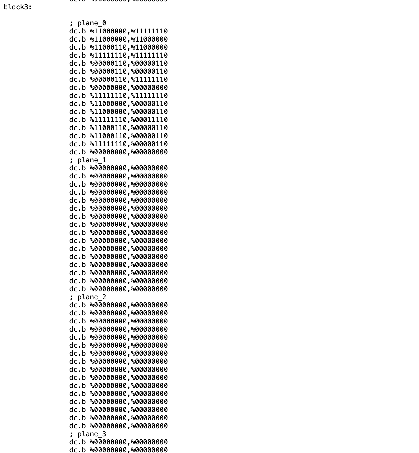 // Ein Amiga-Block mit 4 getrennten Bitmaps vs Atari ST-Block mit 4 Bitmaps in 2*4 Bytes am Ende des BlogArtikels