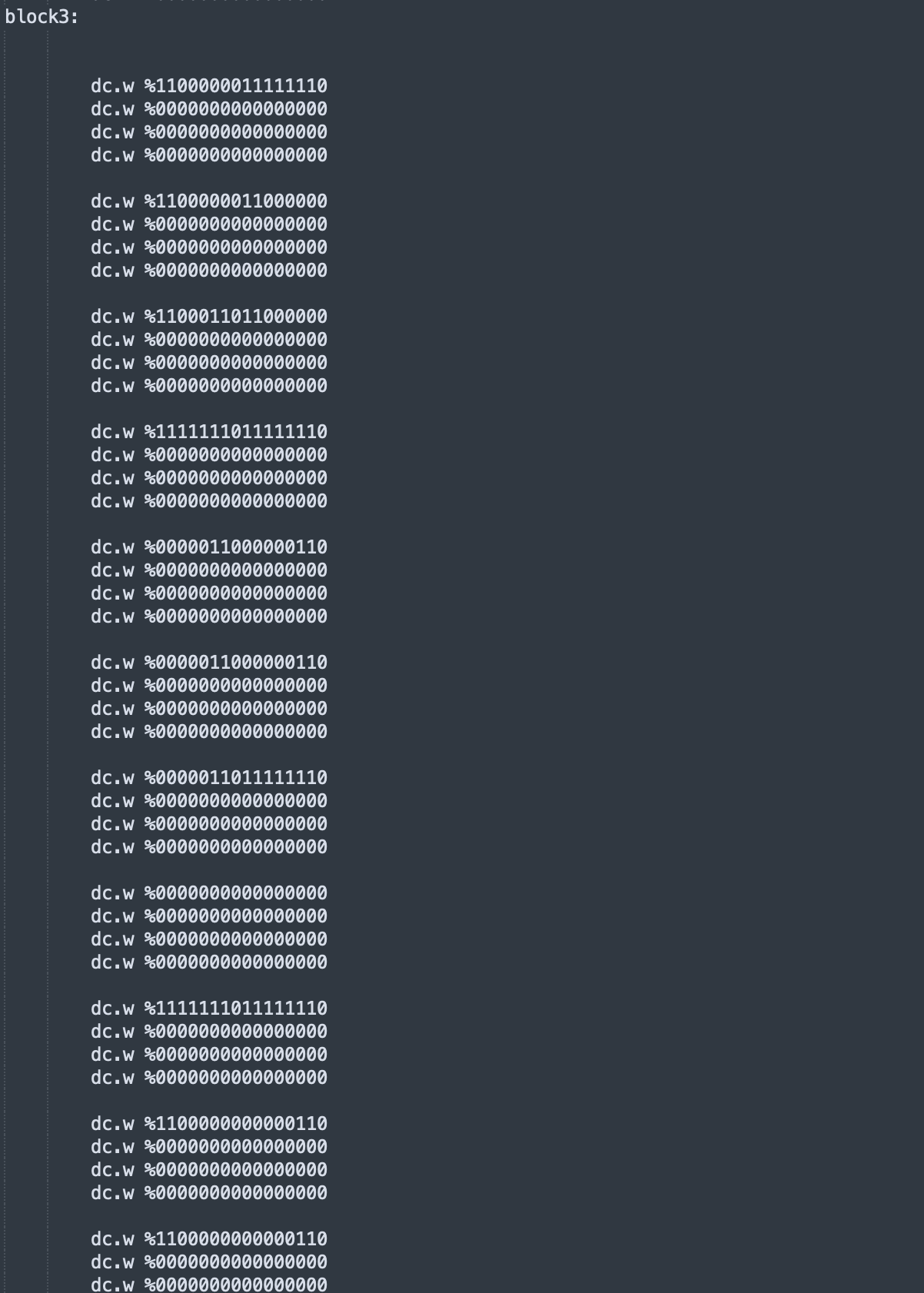 // 16 Pixel = 2 Bytes pro line mit je 4 Bitplanes vgl. dazu getrennte Bitmaps beim Amiga.