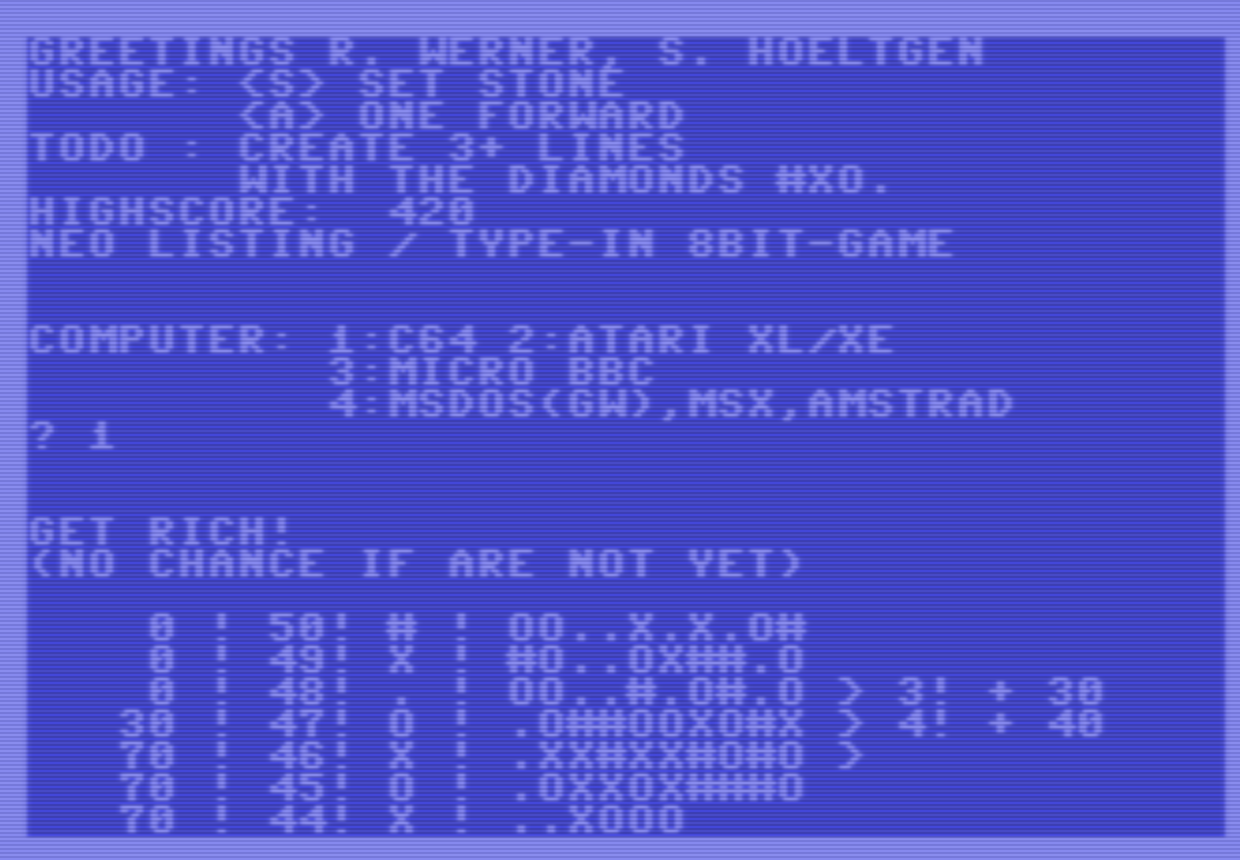 The latest PlotArcadeGame – a Demake of LineJewels a 8Bit-Basic-ResearchGame (more here >). The concept i simple: You get a jewel (on the left side of the line) and you have one possibility to set it in the ongoing cursor. So it is an action game. You have to create 3+ Lines (vertical, horizontal or diagonal). The longer the line is the better.