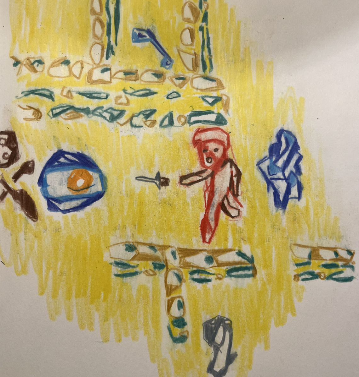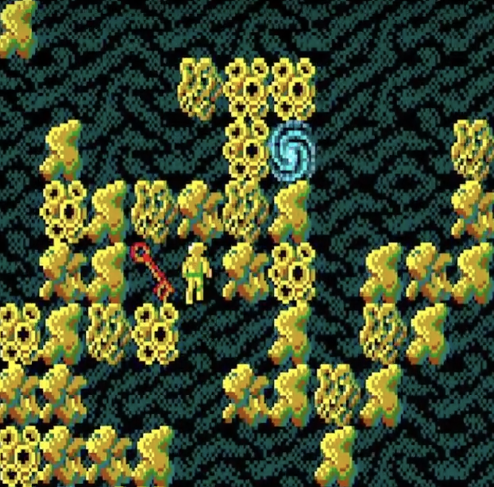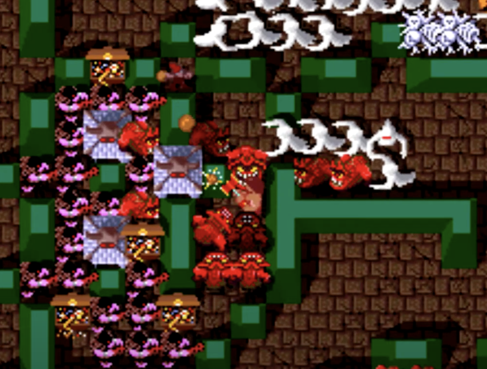 Interessant auch hier bei dem Spiel, die Dinge sind alle gleich gross. Die Welt besteht in dieser Tilebasierung (Spielfeld) wie auch die Monster aus einer Einheitsgrösse. Dadurch bekommen die Objekte eine Art gleiche Wertigkeit. Es ist klar: Alles, was sichtbar ist (Schwarzer Hintergrund) hat dieselbe Bedeutung. Das Sichtbare ist das Wichtige. Spielökonomisch bedeutet es auch, dass die Dinge es zwar Spielfeld und Objekte gibt. Aber für die Erkennung ist klar: Die Dinge sind gleich bedeutend für das Spielgeschehen.