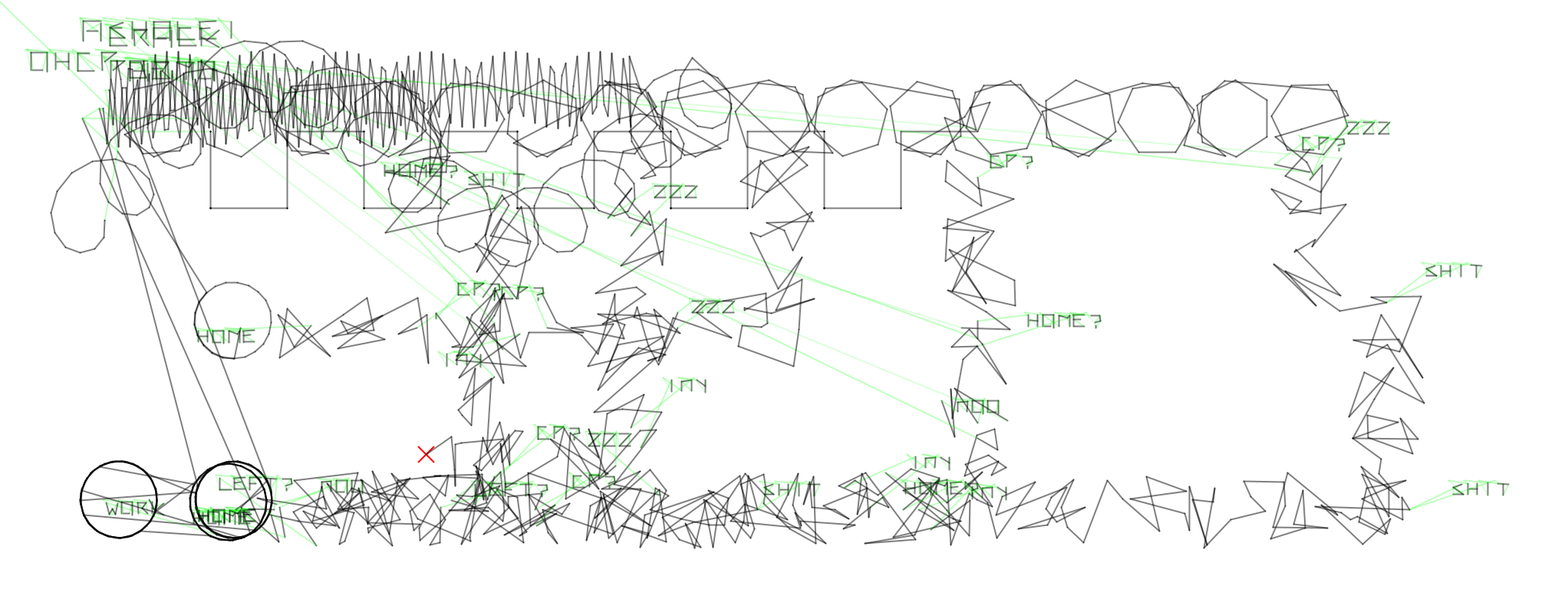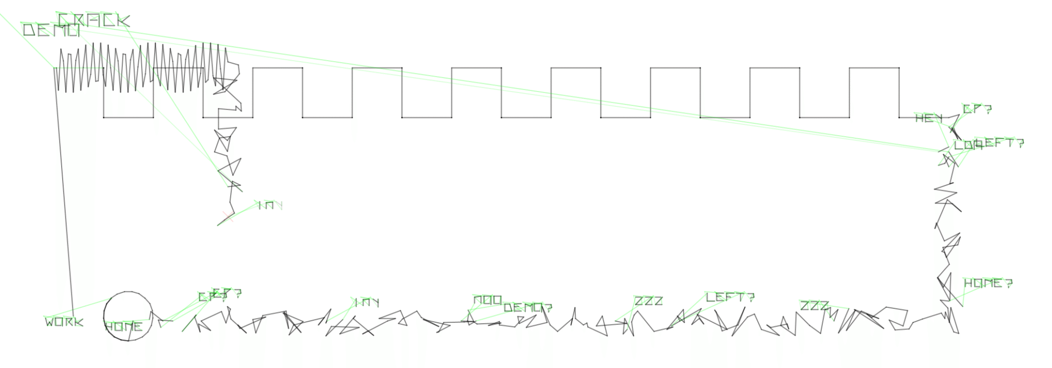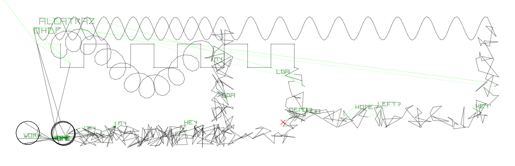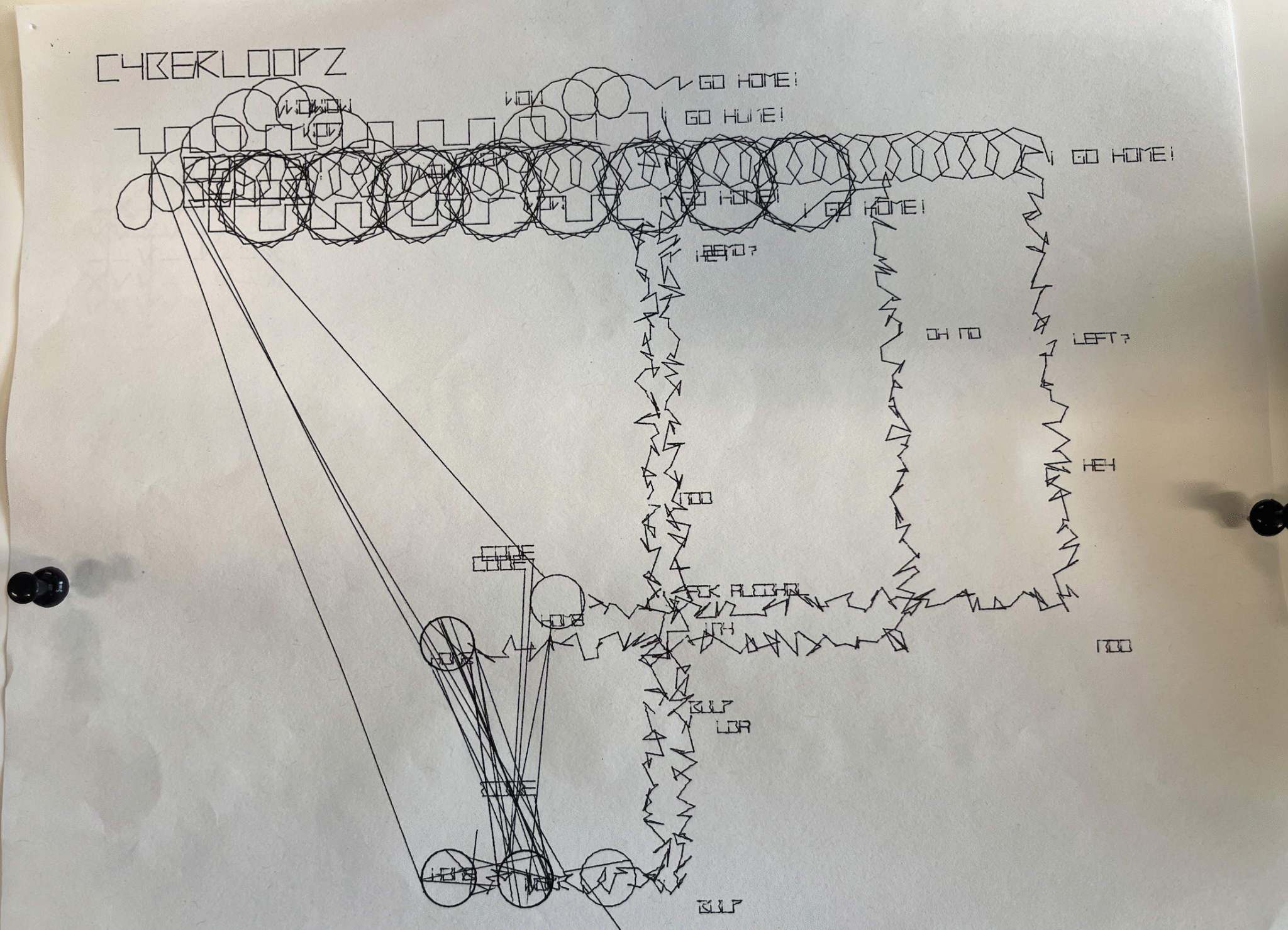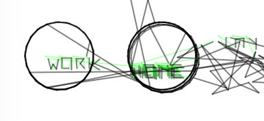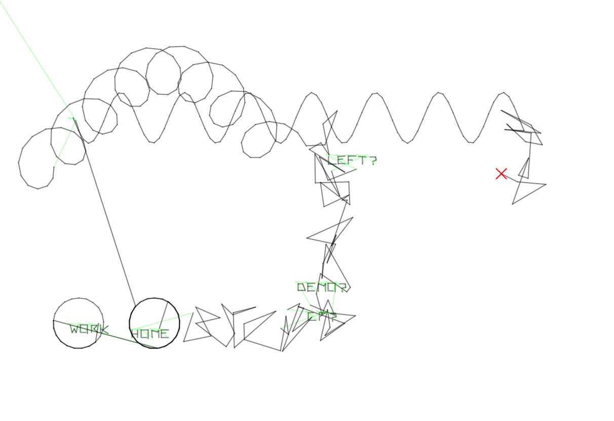 Im Nachfolgenden wurden dann die Ideen der Demoscene quasi zu einem Verschmolzen: Am Anfang klassische Demoscene mit der Power des Alogrithmus sprich „Ein kleiner Algorithmus produziert Grafik“ und danach dann der Wege nach Hause, also die Aufhebung der dritten Wand. Die Linie wird zum Spieler auf dem Heimweg, ein betrunkener zufälliger Spieler. Er trokelt und ihm fallen dabei Dinge ein zur Party, zur Technik. Hier speilt der Zufall aus der prozeduralen Kunst mit. Dann geht die Grafik in einen kybernetischen Kreislauf über. Es geht um Arbeit und Work oder Tod. Dies orientiert sich an der Designers Republic Grafik „“, wobei hier wirklich mit einem kybernetischen Kreislauf gearbeitet wird. Darauf beginnt der nächste Zyklus und die Grafik wird überschrieben. Hier wird dann also – wenig kunstvoll – das Blatt unendlich lange gefüllt. Der Demonutzer* hat hier also die Wahl: Wann bricht er ab? Es ist dasselbe wie im