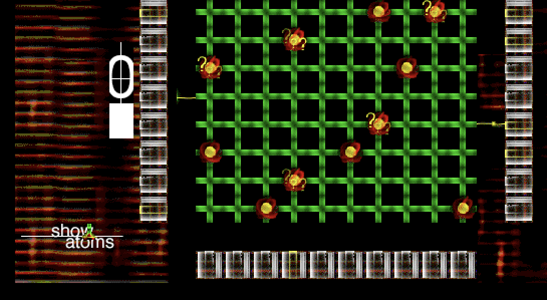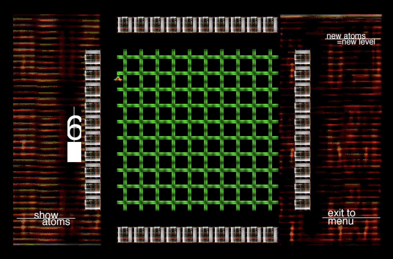 Eine Schwierigkeit beim Spiel ist, dass es sich an einem Raster orientiert. Und dieser muss irgendwie auch im Experimentierfeld sichtbar und klickbar sein. Dann gibt es natürlich Input-Möglichkeiten rund ums Feld herum. Die ersten Entwürfe orientieren sich noch stark an Atomen und Experimenten. Anders das „Endprodukt“, das schon wieder sehr grafisch ist.