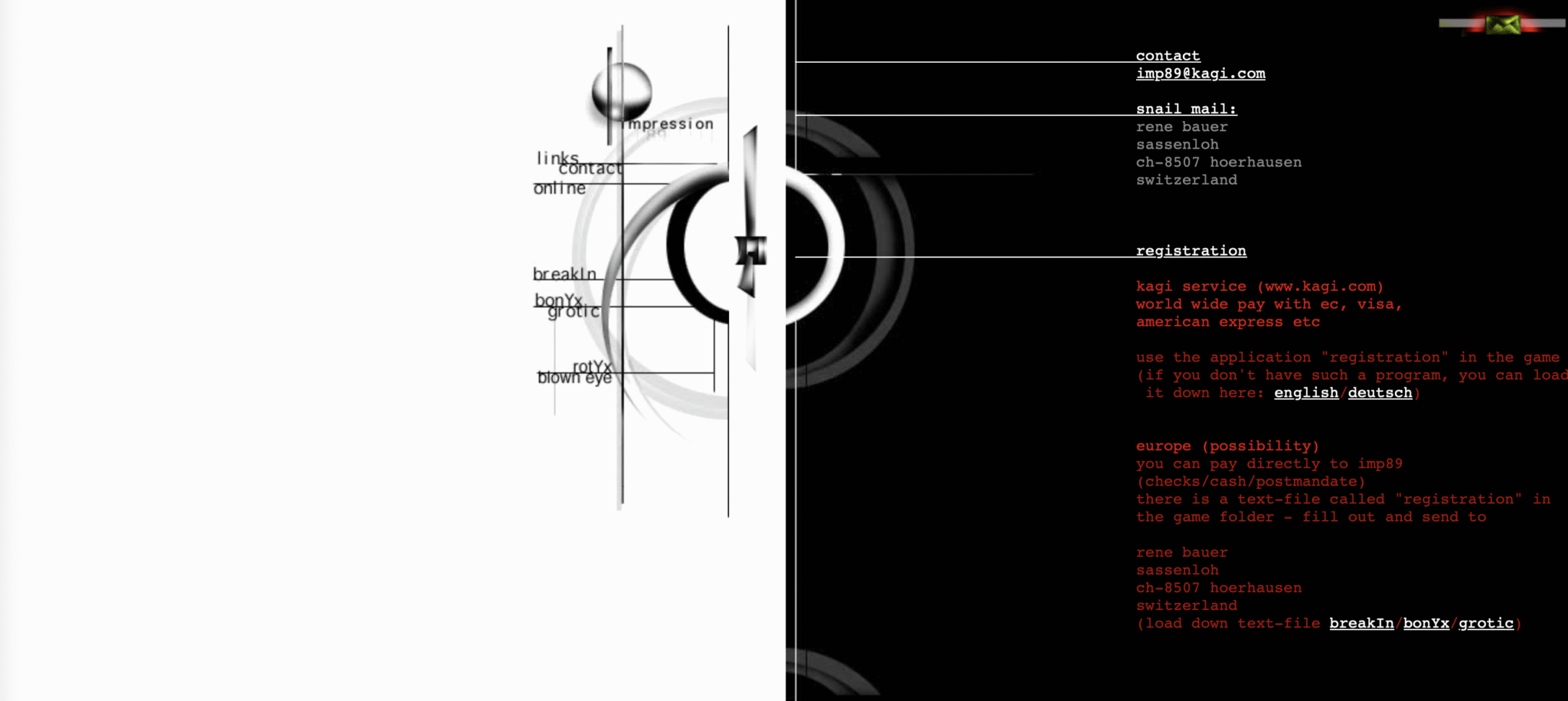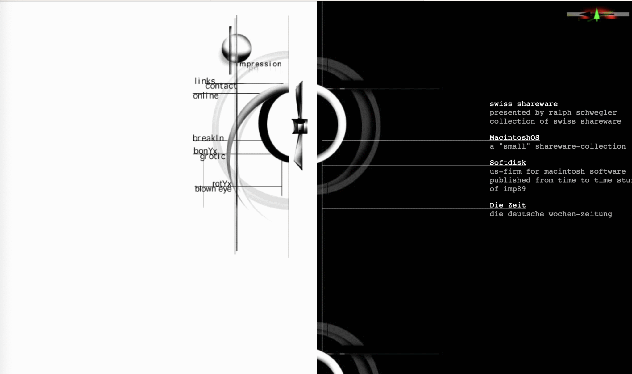 Designers-Republic war die „Nachfolgeseite“ der Imp89-Seite. Sie sollte mehr auf die neuen Inhalte wie Director/Shockwave oder JavaApplet ausgerichtet werden. Der Name ist dabei missverständlich entstanden. Designers Republic war eine bekannte Agentur mit einem sehr eigenen Stil, sie gestalteten etwa das Playstation Spiel WipeOut. Im Game hiess es allerdings „Desian Republic“ also die ‚phonetische Schreibweise‘, dadurch meinte ich kurzzeitig, es gäbe gar kein Designers Republic. Na ja die Webseite war dann schon gelöst.