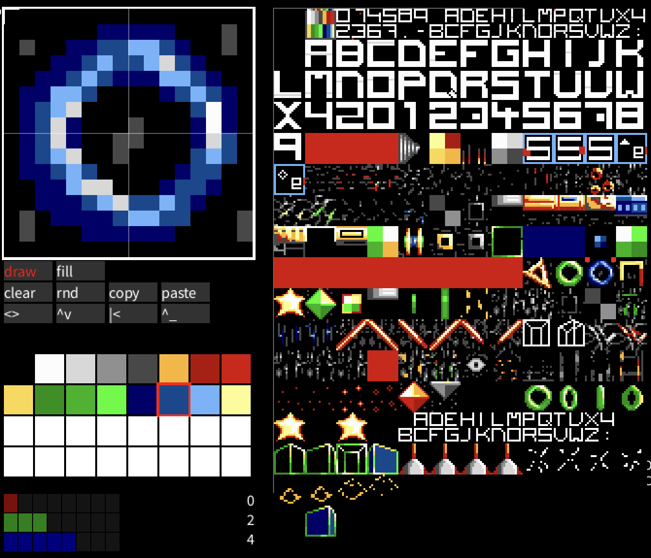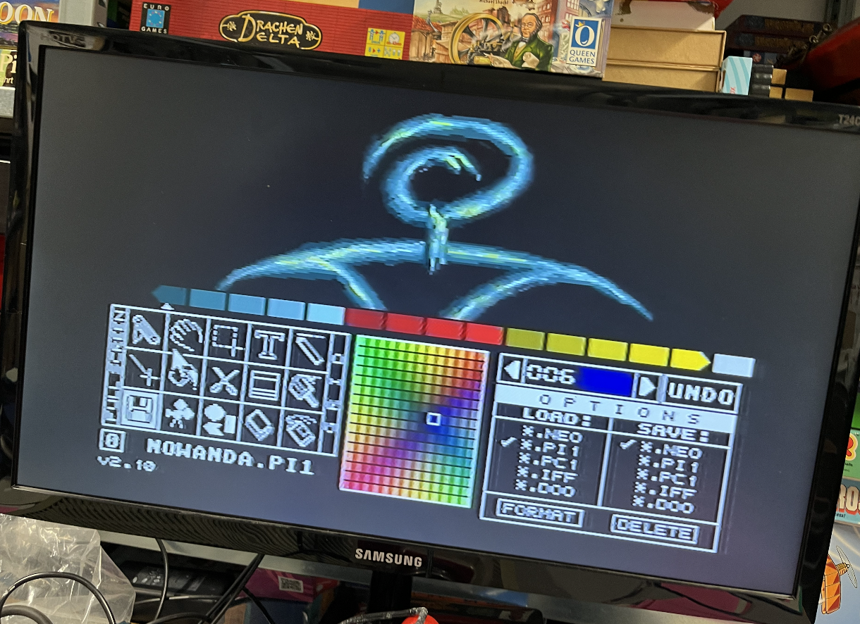 Dabei der Screen von Neochrome gesplitted: Oben da normale Bild und darunter die Farbpalette und die Tools, sowie direkt eine Lupe integriert. Es war also klar, hier wird vorallem gepixelt.