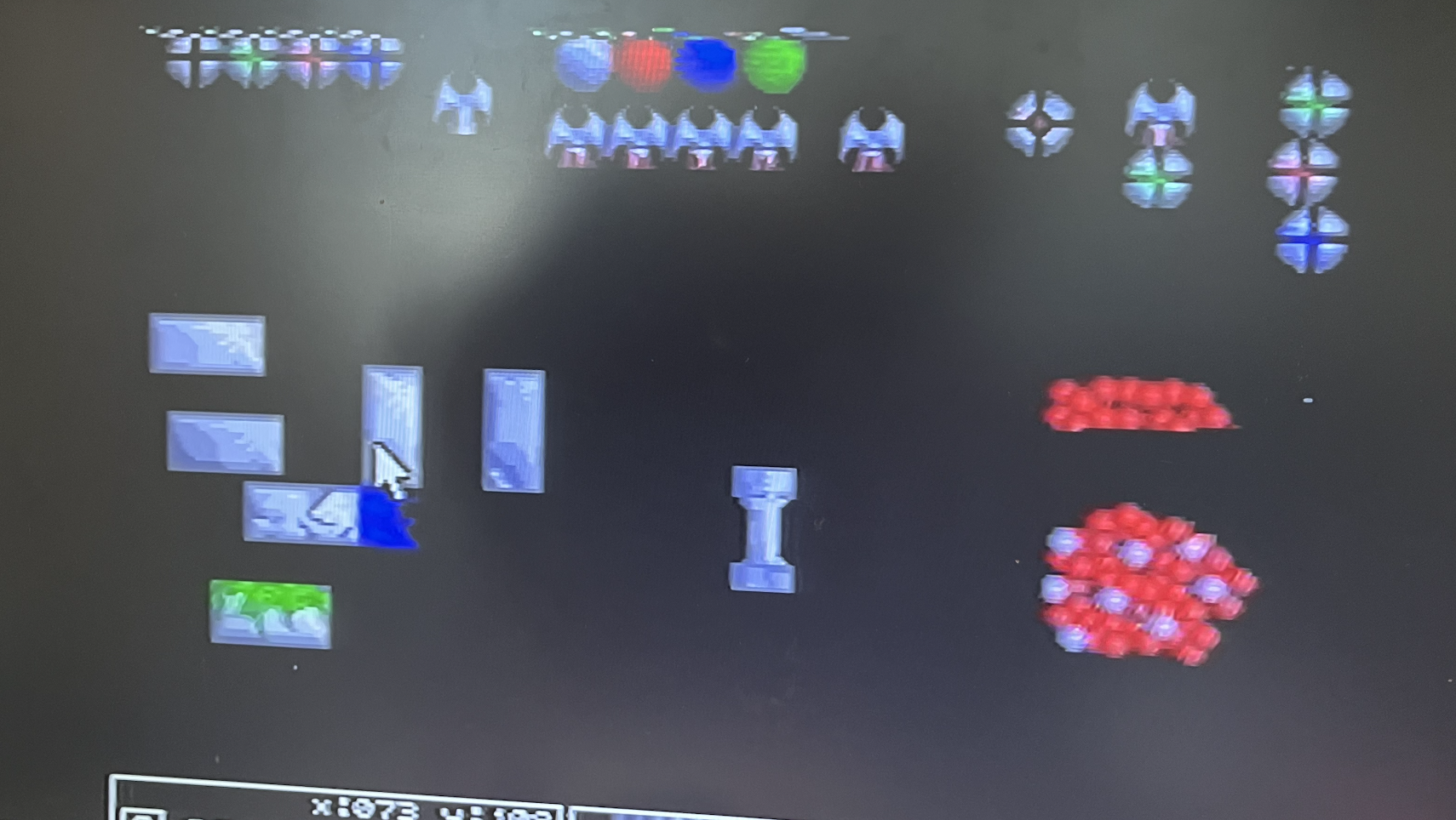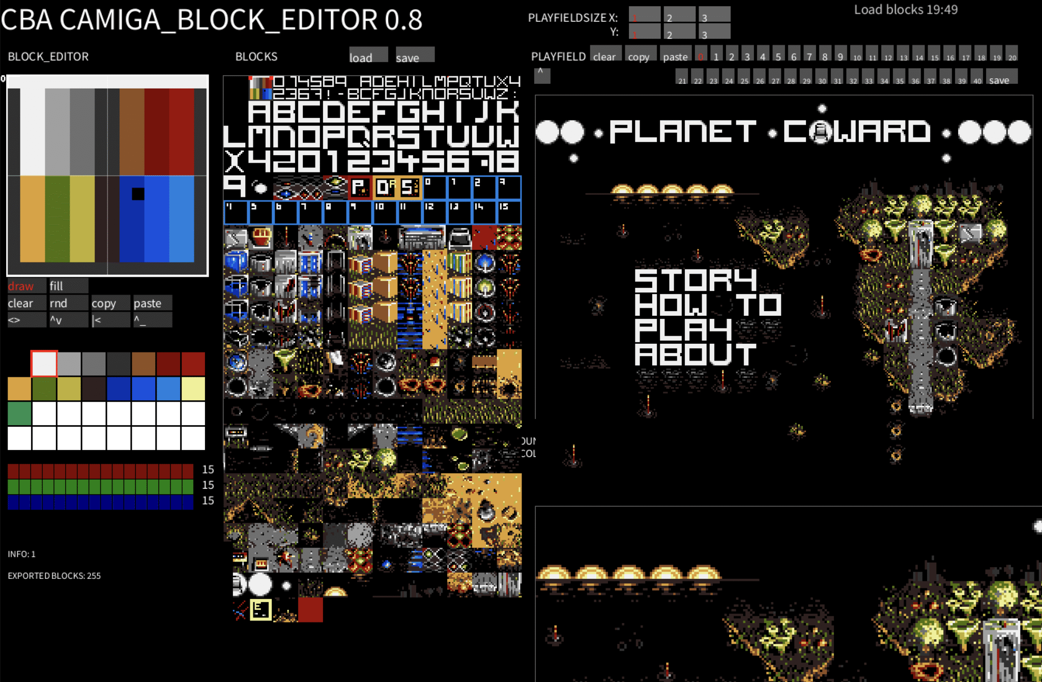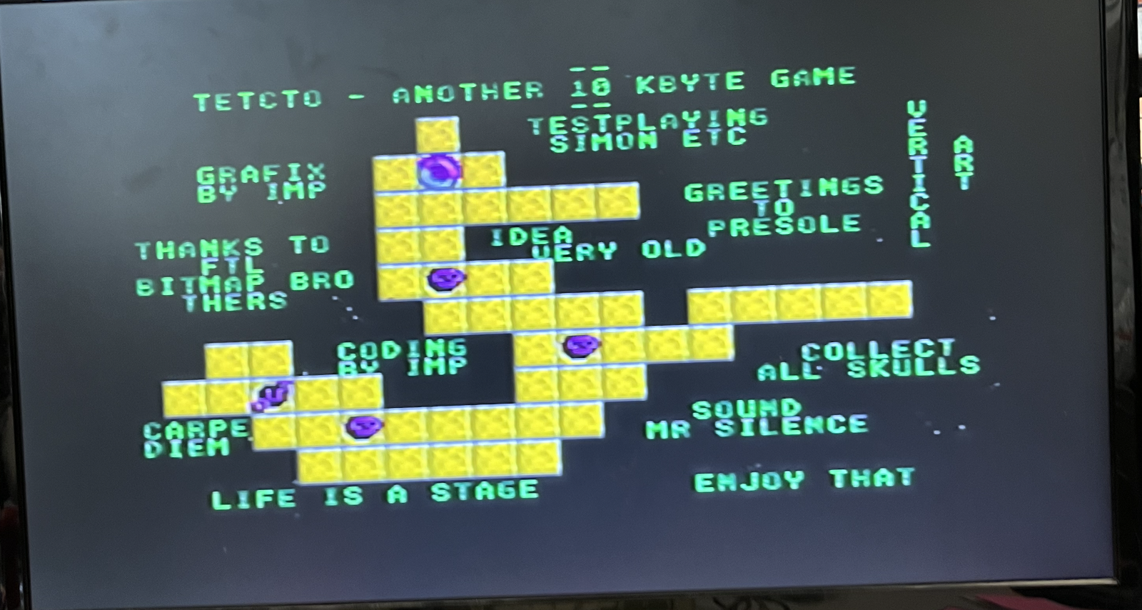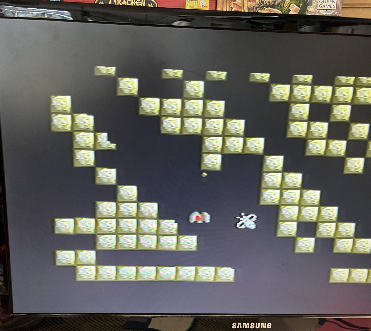 Bei diesem ShootEmUp-Prototype wurde (anders als bei Tecto unten), der Fehler begangen, die Spriteabfrage funktionierte mit Farben (Sprite-Hintergrund). Dabei verwenden viele Spiele nicht mal Hardwarespritecollision sondern schlicht und einfach Rechteck-Abfragen.
