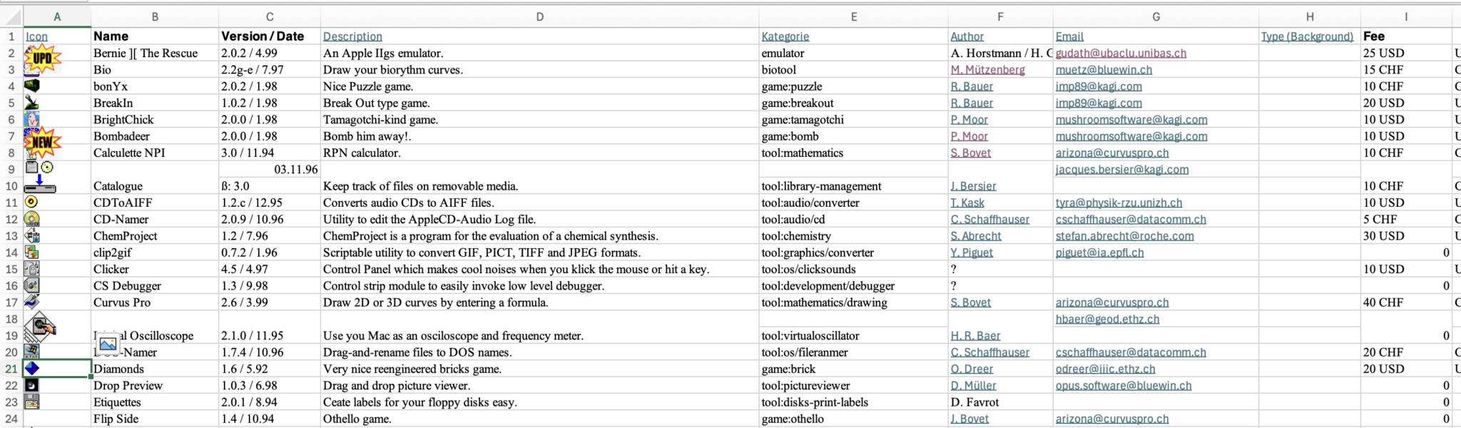 Freeware vs Shareware: Der Weitaus grösste Teil (70%) der Liste ist Shareware. Die Autoren* wollten also durchaus im besten Teil an ihrer Software verdienen, falls die Leute diese schätzten. Freeware waren 20 der 68 Softwareprojekte. Das macht immerhin fast 30%.